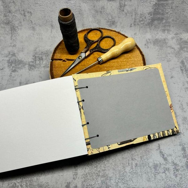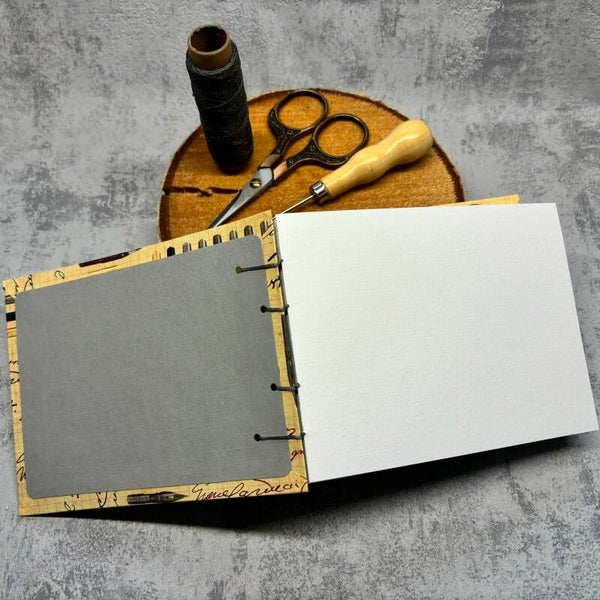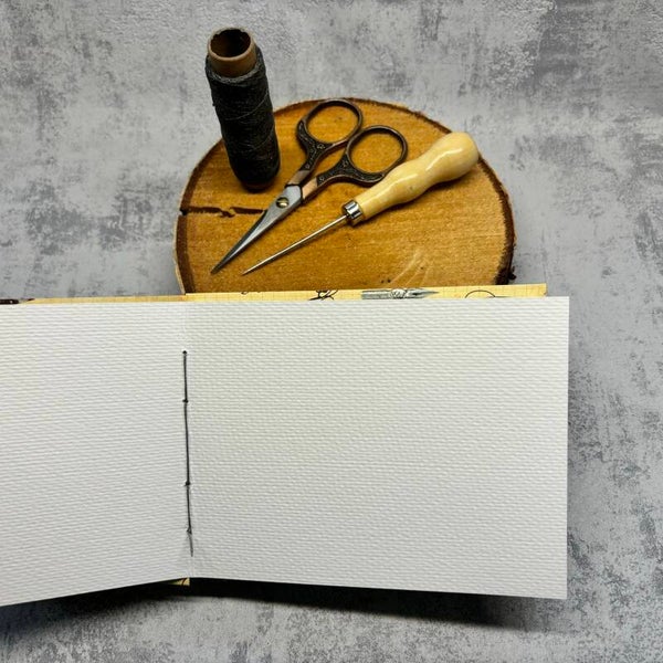 Eingebunden sind 15 Blatt Aquarellpapier, bedeutet für dich du hast 30 Seiten zum gestalten. Grauer Wachsfaden in koptischer Bindung.