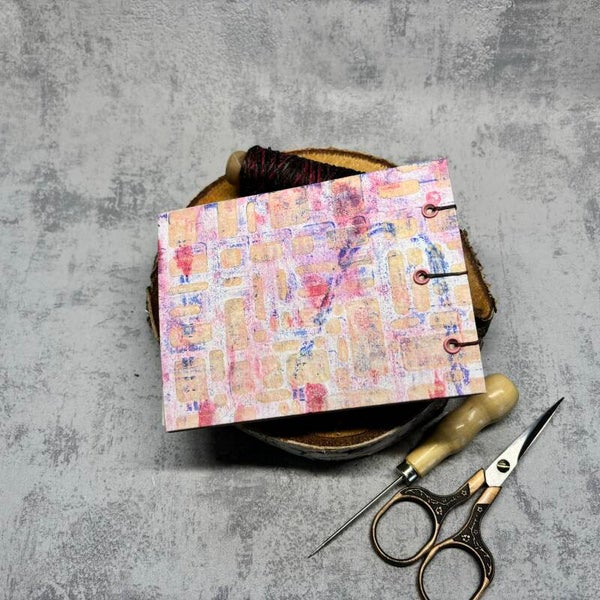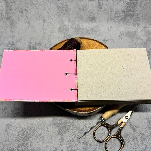 Koptische Bindung mit einem gewachsten Garn im Farbverlauf. Ösen in verschiedene Rosatönen.