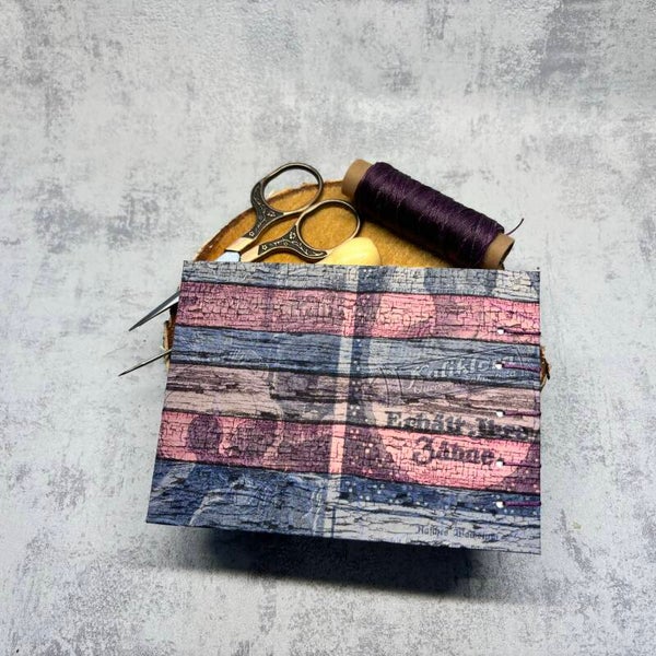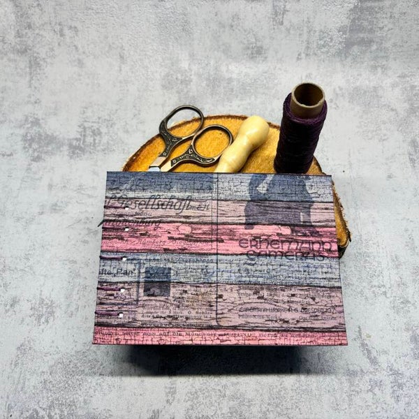 Ein alter Versandkarton bezogen mit alter Buchseite und Serviette.